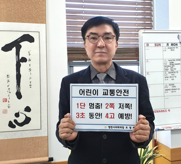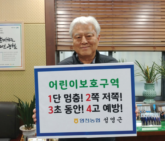 조영제 영천시의회 의장(사진 좌)과 성영근 영천농협 조합장은 2월 25일 어린이 보호를 최우선으로 하는 교통문화 정착을 위한 ‘어린이 교통안전 릴레이 챌린지’에 동참했다. 이번 챌린지는 지난해 12월부터 행정안전부가 어린이보호구역 내 교통사고 예방을 위해 추진 중인 지목 참여 방식의 캠페인이다.