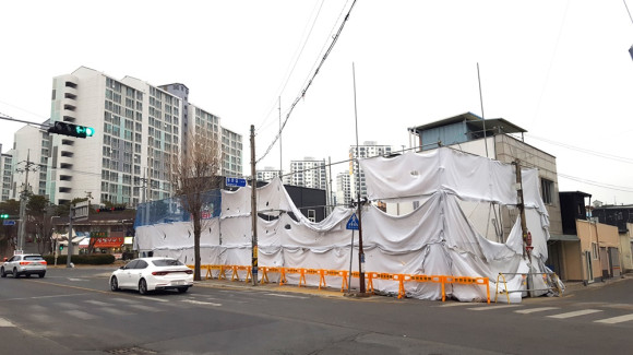 중앙동 도로확장 구간에 상가 철거 작업이 한창이다. 상가 철거 현장에 안전막을 모두 설치했는데, 안전막이 안전하게 설치되지 않아 작은 바람이 불어도 펄럭이며 주변 상인들의 눈살을 찌푸리게 하고 있어 안전막을 안전하게 점검할 필요가 있다.
