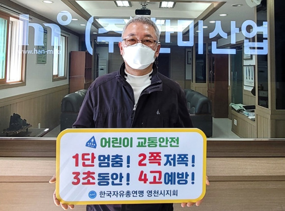 신용범 자유총연맹영천시지회장은 3월 22일 어린이보호구역 내 교통안전 실천 문화 확산을 위해 ‘어린이 교통안전 릴레이 챌린지’ 캠페인에 동참했다. 지난해 12월 행정안전부에서 시작된 이번 릴레이 챌린지는 어린이 보호 최우선 문화가 정착될 수 있도록 국민 아이디어 공모를 통해 선정됐다.