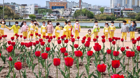 화려한 둔치 꽃밭에 어린이 손님들이 찾아왔다. 둔치에는 수선화 등 봄에 피는 다양한 꽃들이 천지를 덮고 있는데, 16일 오후 이곳을 찾은 어린이들은 선생님의 꽃이 자라는 환경을 설명 듣고 자신들도 돌아가 꽃을 심어 보려는 아름다운 마음을 가지고 돌아갔다.