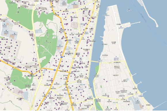 점으로 보이는 것이 설문조사에서 응답자의 표시 행위로 쉽게 생각 할 수 있으나 아니다. 점은 체납차량 위치다. 경상북도에서 전국 최초로 QGIS(지리정보시스템) 활용한 체납자 주소를 빅데이터로 처리, 체납차 위치를 찾아내는 새로운 징수기법이다.