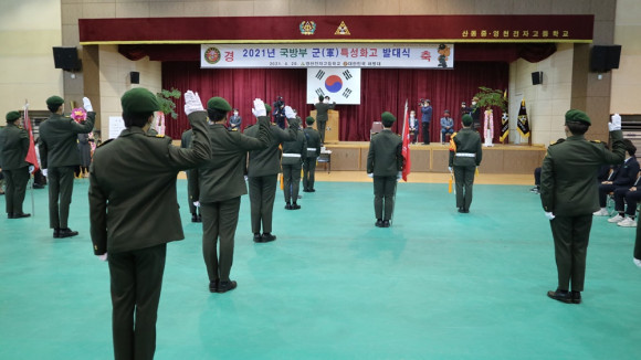 영천전자고등학교(교장 김동환)는 4월 20일 해병대사령부, 도교육청 관계자 및 영천시 기관단체장이 참석한 가운데 영천전자고 길뫼마루에서 2021학년도 국방부 군(軍) 특성화고 발대식을 가졌다.