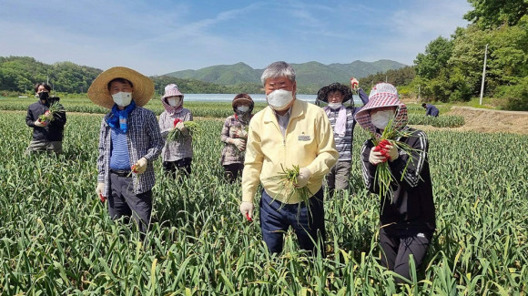 본격적인 영농철이 시작되면서 농촌의 일손부족 현상을 해소하기 위해 영천시가 앞장서고 있다. 이에 영천시 홍보전산실은 5월 6일 윤문조 부시장(앞줄 좌측), 직원 10여 명이 참여해 청통면 계포리의 1600여㎡ 마늘밭에서 마늘종 뽑기를 실시해 농촌사랑을 실천했다.