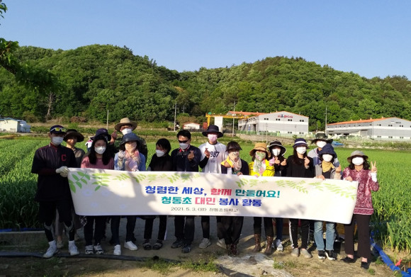 청통초등학교(교장 김중환)는 5월 3일 학교인근의 마늘밭에서 전 교직원이 참여한 청렴다짐 봉사활동을 실시했다.
