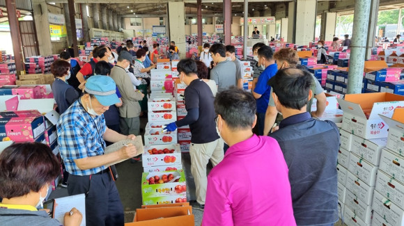 영천도매시장 과일 경매가 한창이다. 7월11일 오후 과일 경매 현장을 찾았는데, 사자 팔자 주문이 균형을 이루고 있지만 팔자(농민들) 물량이 많아 약간 하락 시세를 형성했다. 공판장 관계자는 “지난해 과일 가격이 좋았으나 지난해 비해 올해 현재는 약간 떨어진 가격에 거래되고 있다.”고 했다.