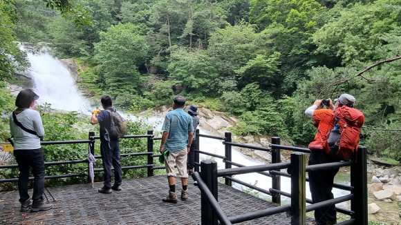 치산폭포가 장관을 이루고 있다. 비가 많이 내린 뒤 주말인 7월 11일, 치산에 등산온 등산객들은 치산폭포의 거대한 물줄기를 보고 감탄을 연발하면서 시원한 폭포 모습을 카메라에 담는 등 치산폭포 감상하는 모습이 폭포 속으로 들어간 듯 했다.