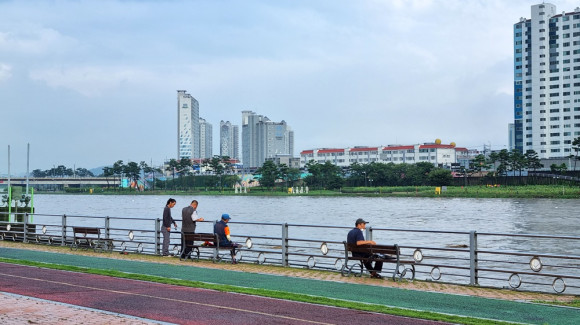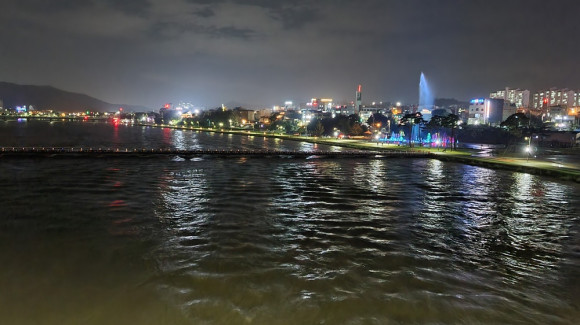 태풍 12호 ‘오마이스’가 8월 23, 24일 영천을 강타했다. 화남·화북·자양면은 많은 피해가 발생했지만 다행히 시내지역은 큰 피해가 없는 것으로 알려졌다. 사진은 시내를 가로지르는 금호강의 수위가 올라 잠수교 턱밑까지 물이 찬 모습이다. 우측 부분에는 분수가 형형색색 춤을 추며 주변 야경과 잘 어울리고 있다.