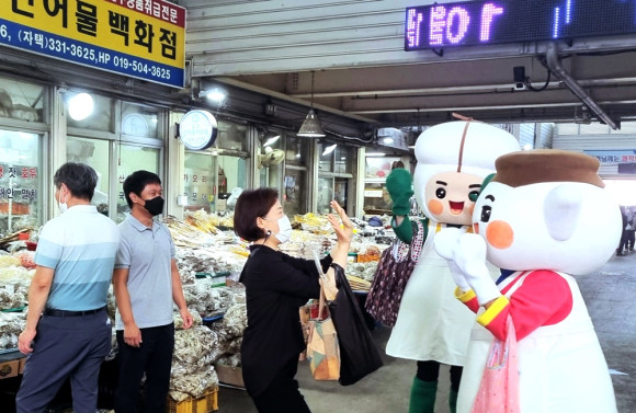 풍요로운 추석이 일주일 앞으로 다가왔다. 코로나19로 인해 모두가 힘든 시기지만 추석명절 만큼은 넉넉하고 행복하길 바라는 마음에 영천공설시장은 대목장 준비에 한창이다. 사진은 9월 9일 한약축제 캐릭터인 한이와 약이가 영천공설시장에서 장보기 행사를 진행하는 모습.