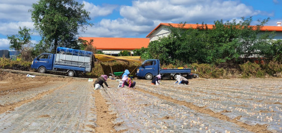 마늘심기가 한창이지만 농민들의 마음은 편하지 않다. 추석연휴 후 코로나19 확진자 대부분이 외국인이라는 말에 마늘파종을 앞둔 농민들이 외국인 노동자를 꺼리고 있다. 사진은 지난 주말 외국인 노동자 대신 가족끼리 마늘을 파종하는 모습이다.