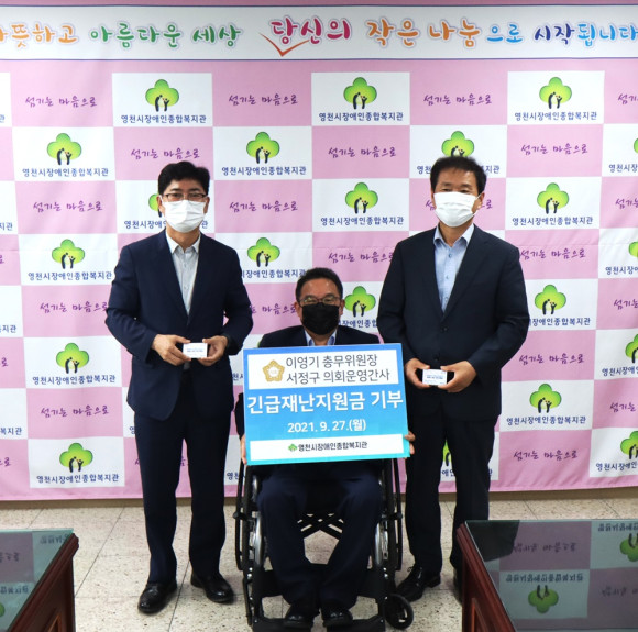 영천시의회 이영기 총무위원장(시의원)과 서정구 운영위원회 간사(시의원)는 9월 27일 영천시 장애인 종합복지관을 방문하고 정부에서 지급한 긴급재난지원금을 기부했다.