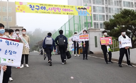 영천중학교(교장 김미라)는 9월 27일부터 10월 1일까지 생명사랑 교육주간을 운영했다. 특히 10월 1일 등굣길에 솔리언 또래상담 도우미 및 학생회 학생들과 함께 생명사랑 의식 함양 및 생명존중 문화 확산을 위한 ‘친구야 사랑한데이’캠페인을 실시했다.