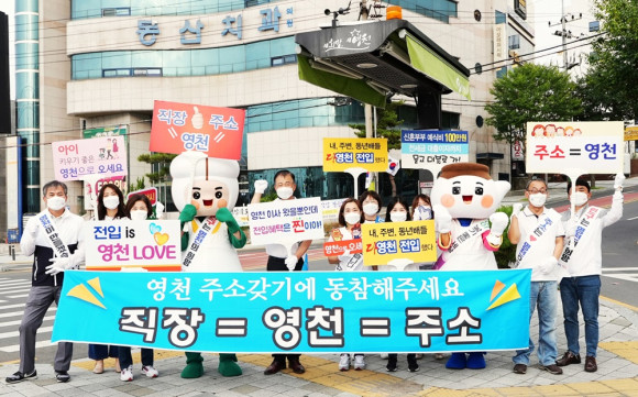 영천시 홍보전산실은 10월 8일 시청 오거리에서 출근 차량을 대상으로 인구 늘리기 캠페인을 진행했다. 이날 캠페인은 홍보전산실 직원과 한약축제 마스코트인 한이·약이가 참여해 전입시책이 담긴 팸플릿과 살기 좋은 영천 이미지를 부각하는 홍보활동을 펼쳤다.