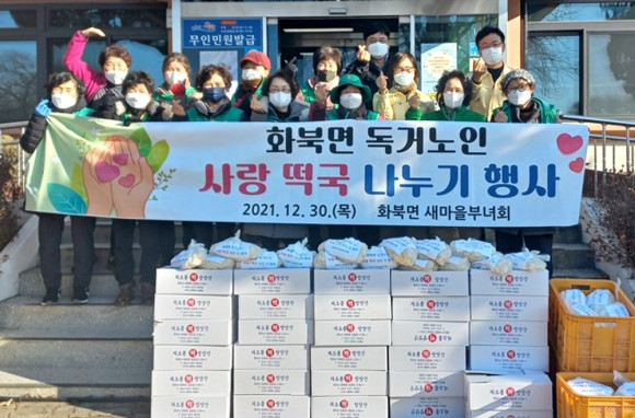 화북면 새마을부녀회는 지난 12월 30일 독거노인 100가구에 사랑의 떡국 떡 나누기 행사를 진행했다. 김금필 회장은 “올해 연말은 코로나19 때문에 더욱 힘들고 외롭게 겨울나기를 준비하시는 독거 어르신들이 아무쪼록 건강하고 따뜻한 겨울을 보내시길 바랄 뿐”이라고 말했다.