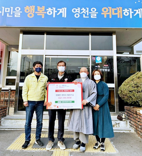 한국불교 태고종 령취사(주지 법성스님)는 3월 10일 지역의 어려운 취약 아동들에게 전달해 달라며 성금 100만원을 영천시 청통면 행정복지센터에 기탁했다. 또 퇴직공무원 김동길 씨(68)가 작년에 이어 올해에도 청통면 아동들을 위해 매월 20만원씩 1년간 정기기부를 신청했다.