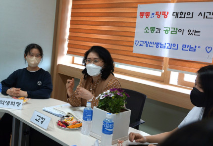 |  | | | ⓒ 영천시민뉴스 | 영천여자고등학교(교장 허영선)는 4월 20일 학생자치회와 학교장과의 소통을 위한 ‘통통퐝퐝 대화’의 시간을 가졌다. 그동안 코로나19로 인해 학교활동이 방역에 집중되다 보니 대화와 토론의 학교 문화가 잠시 주춤할 수밖에 없는 상황이었지만 학생들의 의견을 적극 경청하고 수용하는 시간이 필요하다고 판단되어 이날 학생회 대표들과 따뜻한 담소의 시간을 마련했다.