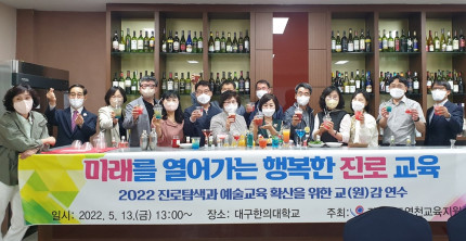 |  | | | ⓒ 영천시민뉴스 | 영천교육지원청(교육장 주원영)은 5월 13일 대구한의대학교(영천진로체험지원센터)에서 관내 유·초·중·고 교(원)감 40여명을 대상으로 진로탐색과 예술교육 확산을 위한 역량강화 연수를 실시하였다. 실내에서 진행된 이번 연수는 코로나19 예방을 위해 개인 방역수칙을 준수하면서 진행되었다. 대구한의대학교는 영천진로체험지원센터로 위탁받아 올해 영천의 초·중·고 학생들의 진로 체험을 담당하게 되었다. 화장품공학부의 화장품 만들기와 호텔조리과의 무알콜 칵테일 만들기 체험을 통해 미리 알아보고 각 학교의 진로체험 정보를 공유하는 시간을 가졌다.