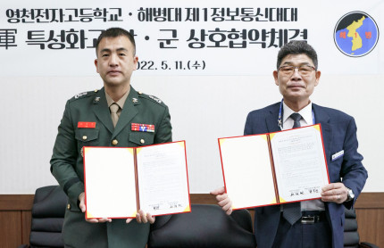 영천전자고등학교(교장 권철환)는 해병대 제1정보통신대대와 학·군 상호협약체결(MOU)을실시하였다. 5월 11일 영천전자고등학교 교무실에서 열린 상호협약체결에는 나국진 해병대 제1정보통신대대장 중령이 참석했다. 나국진 대대장은 “이번 협약이 미래 해병대 정보통신 전력을 향상시키는 좋은 기회가 될 것이라고 생각한다.”며 “우수한 인재 양성에 필요한 교육 및 물자 지원에 최선을 다하겠다.”고 말했다.