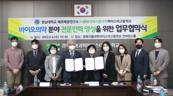 경북식품과학마이스터고(교장 정미정)는 5월 4일 영남대학교 세포배양연구소(소장 최인호)와 세포배양산업 전문인력 양성을 위한 업무 협약을 체결하였다.
