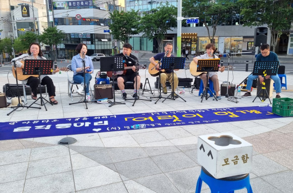 어려운 학생들 돕기로 유명한 음악동아리 ‘여럿이함께’(리더 김정열)가 28일 오후 시청 입구 소공원 노천무대에서 열렸다. 여럿이함께는 매월 셋째 주 토요일 이곳에서 통기타 연주회를 열면서 모금활동을 펼친다. 모금한 금액은 매년 연말 결식과 난치병 투병 학생들에게 전달된다.