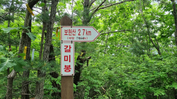 보현산 웰빙숲 팔각전망대에서 능선따라 우측으로 가면 자양면 보현리 갈미봉 안내판이 나온다. 몰상식한 등산객들이 보현산 거리를 27km, 이는 2.7km를 고쳤으며, 높이도 786m를 고쳐서 다르게 표기해두고 있다. 이런 현장이 종종 있는데, 바른 표기를 해야 한다.