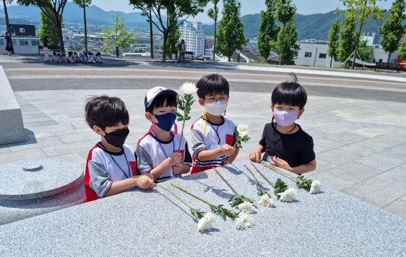 호국보훈의달을 맞아 어린이집 원생들의 충혼탑 참배가 이어지고 있다. 이달 초 새싹어린이집 원생들이 충혼탑을 찾아 참배했으며, 이어 경산시 진량어린이집 원생들도 국화 한송이를 가지고 충혼탑을 참배하고 호국영령의 고귀한 뜻을 선생님들로부터 들었다.