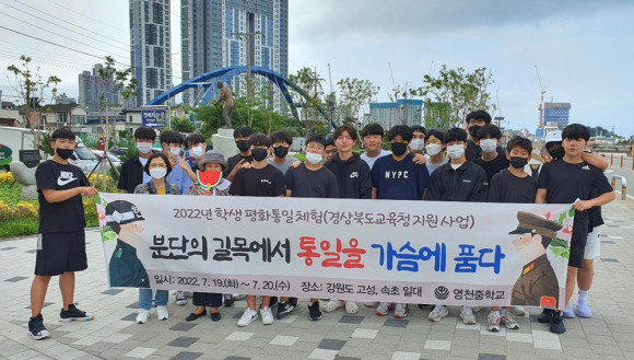 | | | ⓒ 영천시민뉴스 | | 영천중학교(교장 김미라)는 2022 평화통일교육 현장체험학습을 학생 20명을 대상으로 7월 19, 20일 양일간 강원도 고성 통일전망대 일대에서 실시했다.