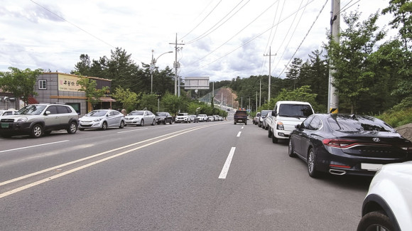 연휴인 8월15일 올해 마지막 복인 말복. 이날 한 삼계탕집 앞 풍경은 도로변 양쪽으로 긴 줄로선 차들이 끝이 보이지 않을 정도다. 이곳은 시내 몫 좋은 곳보다 약간 외곽지에 위치, 도로변 주정차가 용이해 사람들이 많이 찾고 있다.