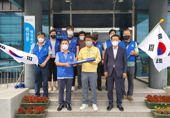 태극기 50개 전달 바르게살기운동 완산동위원회(위원장 신정호)는 광복 77주년 광복절을 맞아 완산동 사무소에 태극기 50개를 전달하고 국기사랑을 실천했다. 태극기는 신정호 위원장이 조남철 동장에 전달했으며, 김선태 시의원도 참석했다.