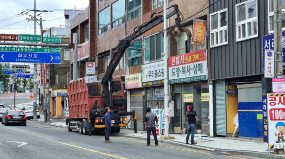 중앙동 도로확장 마지막 구간인 영천교 일대 상가들이 철거된다. 18일부터 철거를 시작한 철거업체 관계자들이 건물 외벽에 있는 시설물부터 철거를 시작(태풍피해 예방)하고 있다. 1주일 전에는 스레트 작업팀들이 현장에 와서 스레트 제거작업을 먼저하기도 했다.