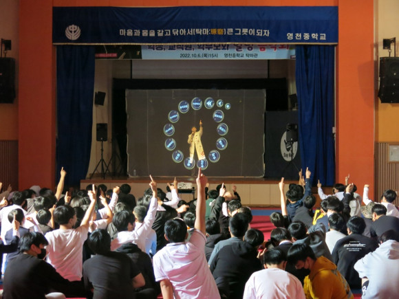 | | | ⓒ 영천시민뉴스 | | 영천중학교는 10월 19일 학생들을 대상으로 학생 흡연예방 홀로그램 공연을 진행했다. 이번 행사는 2022학년도 흡연예방 및 금연실천 심화형 학교 운영의 일환으로 기획하였으며 효과적인 교육을 위해 학년별로 나누어 공연을 관람했다.