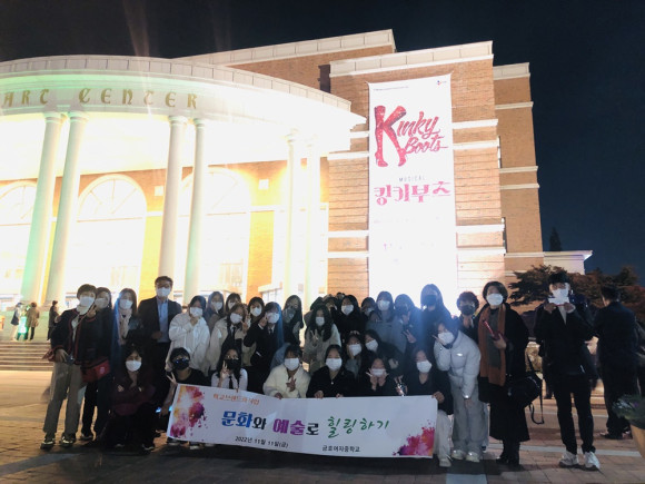 금호여자중학교(교장 박영남) 전교생은 11월 11일 대구 계명아트센터에서 뮤지컬 ‘킹키부츠’를 관람했다. 이번 공연 관람은 영천시에서 학교별 특화사업의 일환으로 지급되는 보조금으로 ‘문화와 예술로 힐링하기’라는 주제로 코로나19 방역 수칙을 준수하며 진행되었다. 뮤지컬 ‘킹키부츠’는 전혀 다른 두 남자의 환상적인 팀워크로 성공에 이르는 동안 발생하는 갈등과 고난을 소재로 하는 뮤지컬로 꿈을 이루고 싶은 모든 이들에게 감동과 희망을 선사하는 내용이다. 이를 통해 정서 순화 및 진로 탐구에 대한 의욕을 고취하는 등 긍정적인 품성을 키울 기회가 되었다.