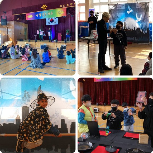 마술 및 버블 체험은 아이들의 행복한 공연문화예술콘텐츠를 만드는 사회적 기업 ‘블루아트 컴퍼니’에서 학교로 방문하여 학생들에게 공연과 체험 활동을 제공하였다. 학생들은 먼저 마술공연을 감상한 뒤 마술도구와 창의도구존에서 배운 마술을 체험하고, 관련 의상들을 착용해보며 포토존에서 사진 찍는 시간을 가졌다.