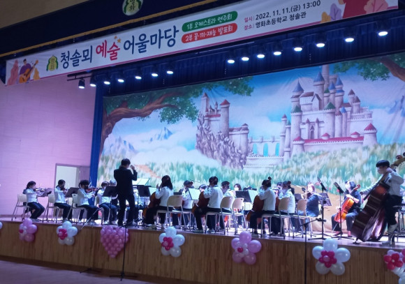 | | | ⓒ 영천시민뉴스 | | 영화초등학교(교장 권해인)는 11월 11일 영화초 청솔관에서 청솔뫼 예술어울마당을 실시하였다. 1부와 2부로 나누어진 청솔뫼 예술어울마당에서는 유치원부터 1~6학년까지 전교생이 각자의 꿈·끼·재능을 뽐내며 즐겁고 유익한 시간을 보냈다. 1부 영화 오케스트라 연주에서는 레미제라블을 포함한 다양한 악곡을 연주하며 각종 앙상블 및 합주 발표가 이루어졌다. 2부 학년별 작품 발표회에서는 즐겁고 신나며 생생한 학년별 발표가 이루어졌다.