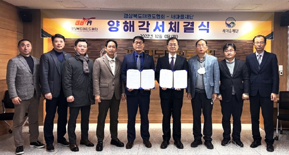 새마을재단(대표이사 이승용)과 경북태권도협회(회장 이성우)가 12월 6일 협약을 했다. 양 단체는 새마을운동과 태권도를 접목한 시범단 운영, 해외순회 사범단 운영, 해외봉사단활동 및 새마을대회 개최 등 광범위한 계획을 논의하고 협력하기로 했다. - 장칠원 기자 -