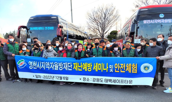 영천시 지역자율방재단(단장 신재경)은 12월 6일 영천체육관앞에 집결, 강원도 태백시 365 세이프타운에서 열린 재난예방세미나 및 안전체험 행사에 참여했다. 이날은 영천시 16개 읍면동 지역자율방재단원 전체가 2대의 버스에 나눠 타고 참가했다. - 김영철 기자 -
