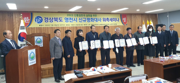 2022 신통일한국 실현을 위한 경상북도 영천시 신규평화대사 위촉세미나가 13일 오전 영천시산림조합 3층 대회의실에서 한혜련 전 도의원, 성영관 전 영천문화원장 및 회원 등 100여 명이 참석한 가운데 열렸다.