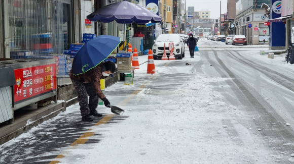 12월 21일 아침 내린 눈으로 시내가 온통 하얗게 변했다. 새벽에 내린 눈으로 아침 출근길 도로는 곳곳에서 정체를 빚었다. 도로변 가게들은 일찍 나와 눈을 치우며 손님 맞을 준비하는 모습도 보였다. 이날 내린 눈은 0.8cm. - 김영철 기자 -