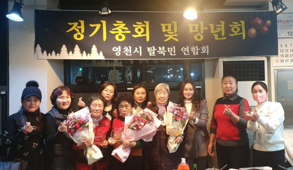 탈북민 영천시연합회(회장 설명희) 정기총회 및 송년모임이 12월 18일 시내 한 식당에 서 열렸다. 이날 행사에는 30여 명의 회원들이 참석하고 고향에 대한 향수와 고향 떡 시식, 행운권 추첨 등으로 즐거운 시간을 보냈다. - 김영철 기자 -