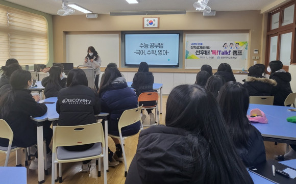 영천여자고등학교(교장 신덕섭)는 1월 2일 ‘나만의 진로-진학설계를 위한 선·후배 톡!Talk! 캠프’를 진행하여 입시에 대비한 선배들의 입시비법에 대한 경험과 노하우를 발표하고 후배들이 그 비법을 전수받는 시간을 가졌다. 2023년 새해에 입시를 앞두고 어느 때보다 초조할 1, 2학년 후배들에게 가장 도움이 되는 것은 다름 아닌 ‘먼저 입시를 겪은 선배들의 조언’이라는 판단으로 진행된 이번 행사는 3학년 선배들의 희망 진로에 맞춘 자신만의 자기주도적 학습방법, 계열별 학생부 관리방법 등 입시에 대비하는 자신만의 관리방법과 아쉬웠던 경험에 대한 발표와 1, 2학년 후배들의 질의와 응답으로 이루어졌다.