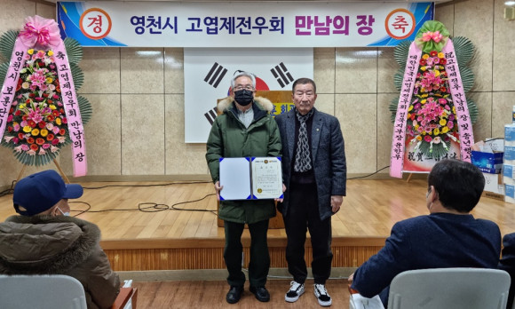 영천시고엽제 전우회(회장 황태수)는 12월 30일 오전 보훈회관 4층 강당에서 영천시고엽제 전우회 만남의 장을 개최했다. 고엽제 전우회 만남의 장은 총회를 겸해서 개최됐으며, 고엽제 경북지부장, 국회의원, 영천시장, 영천시의회의장 표창 등이 회원들에 전달됐다.
