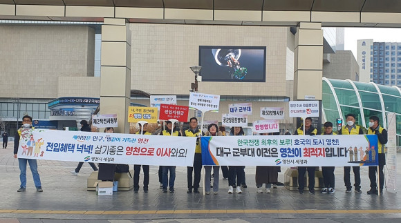 영천시민들의 군부대 이전 목소리가 대구에서도 울려 퍼졌다. 영천시청 세정과(과장 이의웅)는 2월 15일 동대구역에서 대구군부대 영천 유치 및 영천 인구늘리기 캠페인을 실시했다. 이번 캠페인은 관외 거주자의 체납세 징수를 위해 구성한 체납세 징수 기동반과 함께 체납세도 징수하고 영천시의 염원인 대구군부대 성공적인 영천 유치 운동 및 인구 늘리기 홍보 캠페인도 병행해 추진했다.