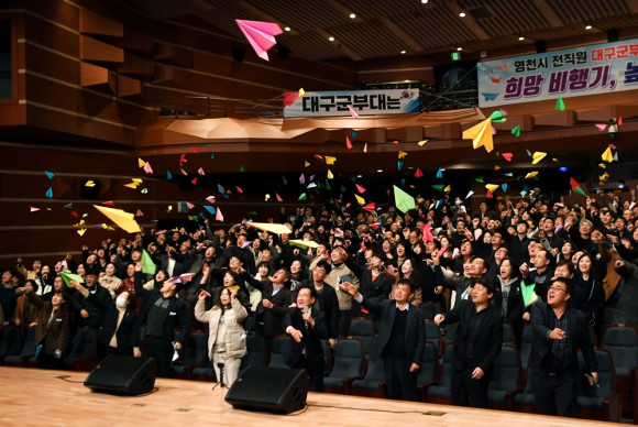 대구군부대 유치를 기원하는 문구가 적힌 종이비행기가 높이 날아올랐다. 영천시는 2월 21일 영천시민회관에서 대구 군부대 유치 기원 종이비행기 날리기 퍼포먼스를 진행했다. 형형색색의 종이비행기에 저마다 군부대 유치를 기원하는 문구를 적어 군부대 유치를 향한 간절한 마음을 표현했다.