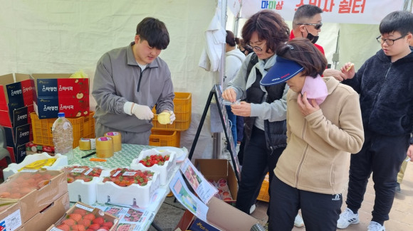 미나리 삽겹살 소비촉진 행사장에 딸기와 사과 판대도 등장했는데, 지역에서 농사짓는 20대 젊은 농부(김영재, 황영식)들의 상품으로 사과는 저장 상품이지만 딸기는 현재 한창 출하중이라 행사장을 찾은 소비자들에 인기를 독차지, 18일에는 순식간에 하루 판매량을 완판했다.