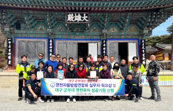 영천자율방범연합회(회장 최붕환)는 3월 18일 포항 내연산에서 실무자 워크숍 및 대구 군부대 영천유치기원 산행대회를 개최했다. 이날 산행대회는 회원 40여명이 참석하여 출발 전과 포항에서 대구 군부대 영천유치를 기원하는 퍼포먼스를 펼쳤다.