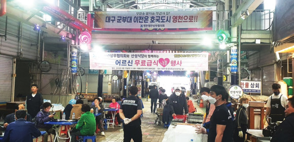영천공설시장내 산성식당(대표 김순자)에서는 15일 시장 휴무일 어르신 무료급식 봉사활동을 폈다. 봉사활동에는 이만희 국회의원, 최기문 시장, 이춘우 도의원 및 시민 700여 명이 참석해 즐거운 식사를 하고, 청년상우협의회에서 나와 음식 나누는 봉사활동을 펴기도했다.