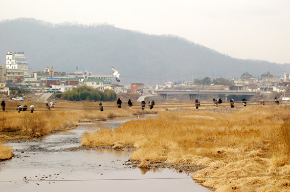영천교 인근 금호강을 가로지르는 전선줄에 비둘기 수십마리가 내려앉아 휴식을 취하고 있다. 영천시의 시조인 비둘기가 떼지어 모여든 것은 보기드문 광경이다.
