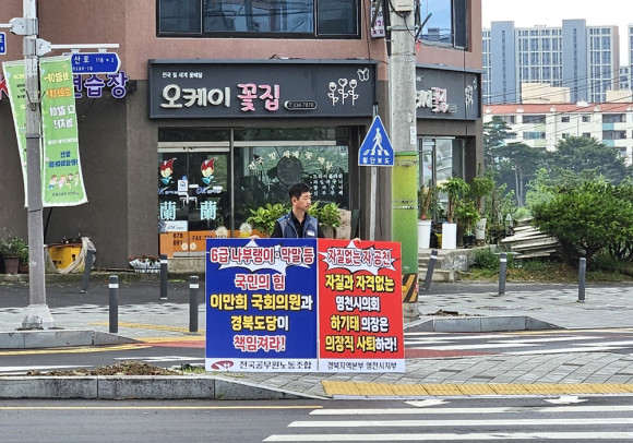 전국공무원노동조합 영천시지부는 7월 24일부터 시청오거리에서 하기태 시의장의 의장직 사퇴촉구 1인 시위에 들어 갔다. 앞서 노조는 의장직 사퇴 시까지 거리현수막을 게첨하고 출근 시간대 시청오거리 뿐만아니라 읍면동 정문에서 1인 시위를 이어 나가기로 결의했었다.
