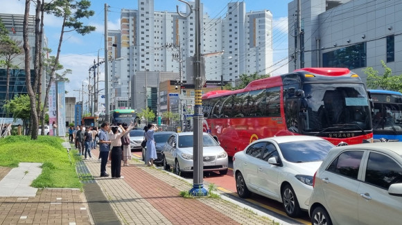 영천시 장학회에서 주관하는 초등고생 해외어학연수 과정에 선발된 학생들이 19일 오후 시립도서관앞에서 인천공항가는 버스에 타고 있는데 학부형들은 “건강하게 잘 다녀와”라고 배웅하고 있다. 학생들은 싱가포르와 말레이시아에서 3주간 어학 연수 등을 하고 돌아온다.