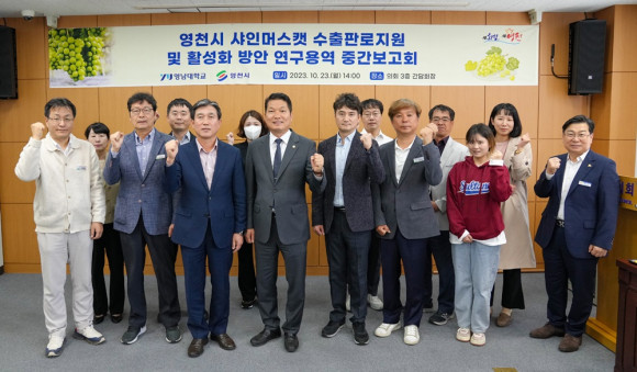 영천시의회 의원연구단체인 ‘영천시 샤인머스캣 수출판로 지원 및 활성화 방안을 위한 의원연구모임’은 10월 23일 영천시의회 간담회장에서 영천시 샤인머스캣 수출판로지원 및 활성화 방안 연구용역 중간보고회를 개최했다.