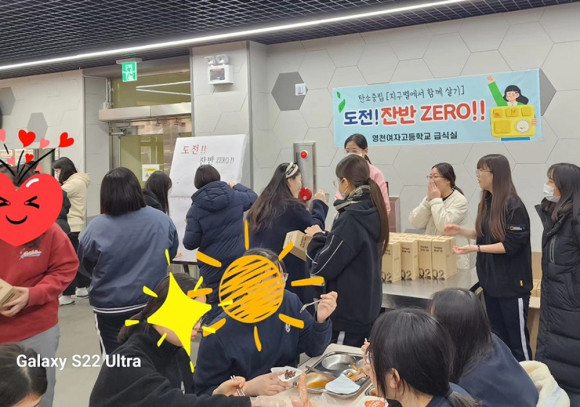 | | | ⓒ 영천시민신문 | | 영천여자고등학교(교장 신덕섭)는 12월 7일, 8일 양일에 걸쳐 학생생활안전부 및 급식실 주관으로 12시 30분에서 13시 20분까지 학생들이 지구환경 살리기 운동에 동참할 수 있도록 ‘지구별에서 함께 살기’ 이벤트를 전교생을 대상으로 진행했다.